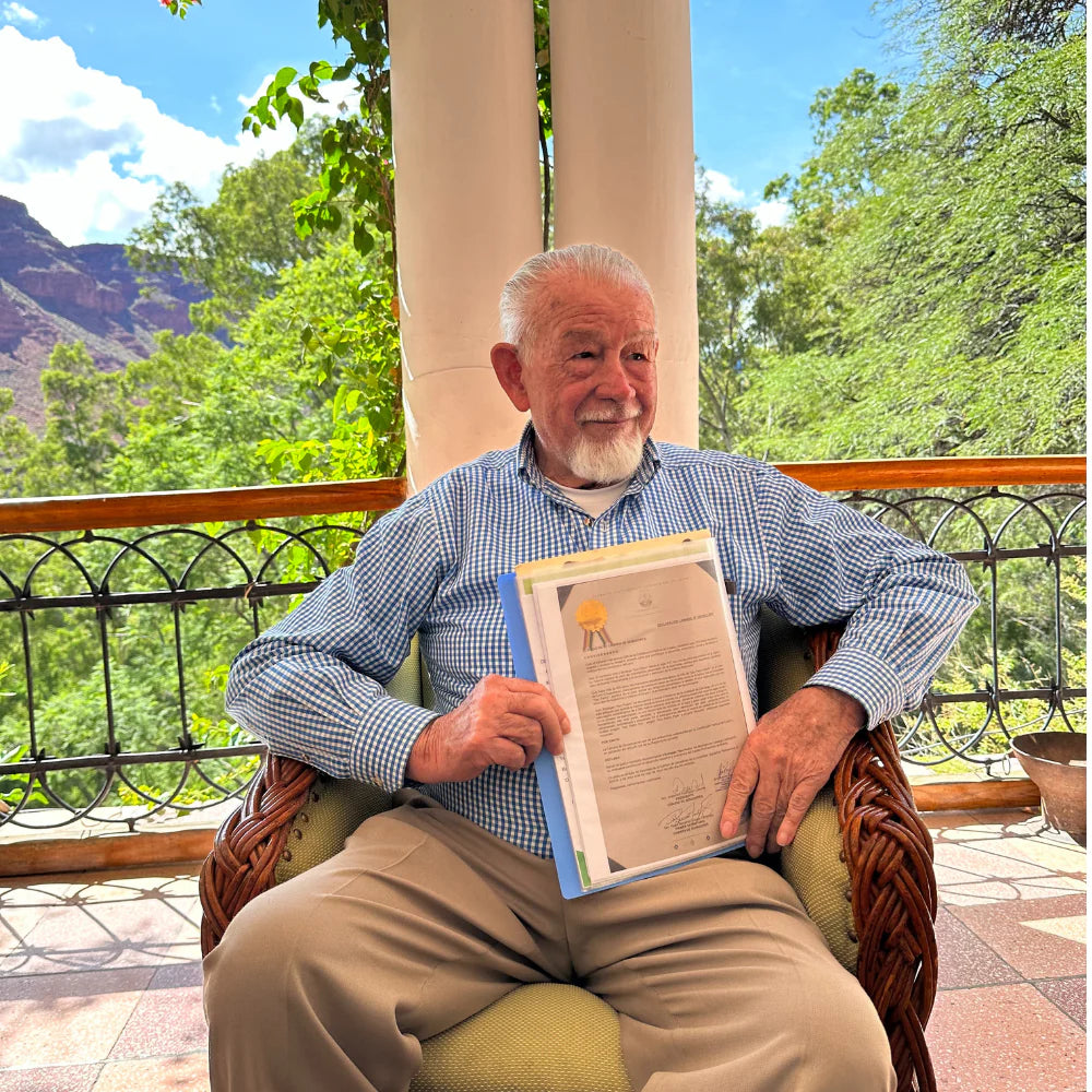 手に持っていらっしゃるのは、政府から送られたボリビア最古の蒸留所という証明書です。