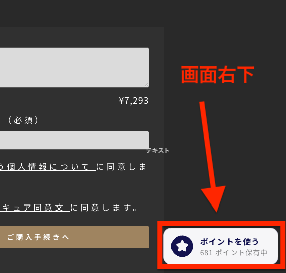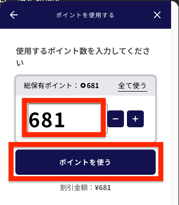表示されたポップアップ内で、使用したいポイント数を入力し、「ポイントを使う」ボタンをクリックします。